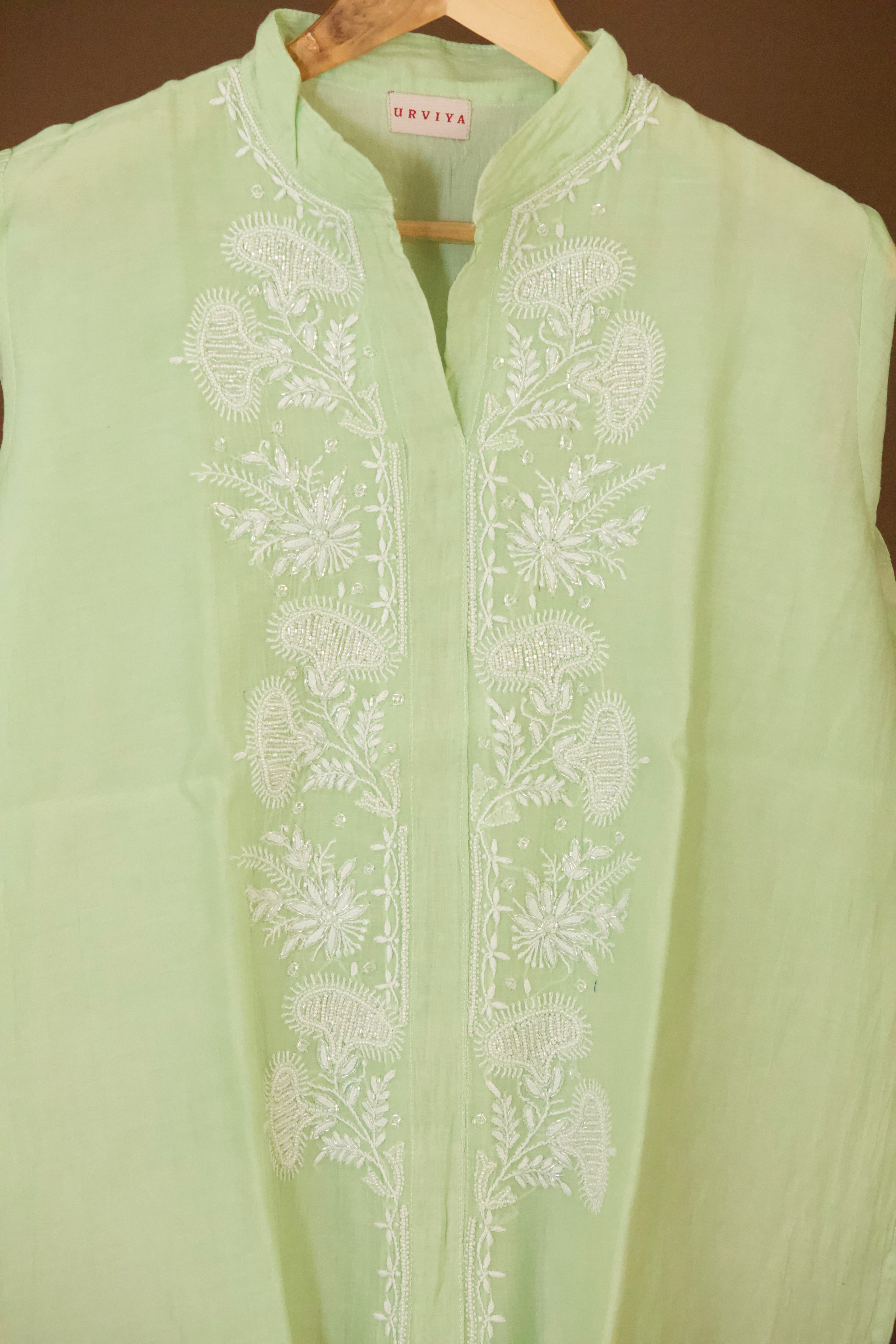 This mul chanderi co-ord set features delicate chikankari enhanced with pearl and cutdana accents.
