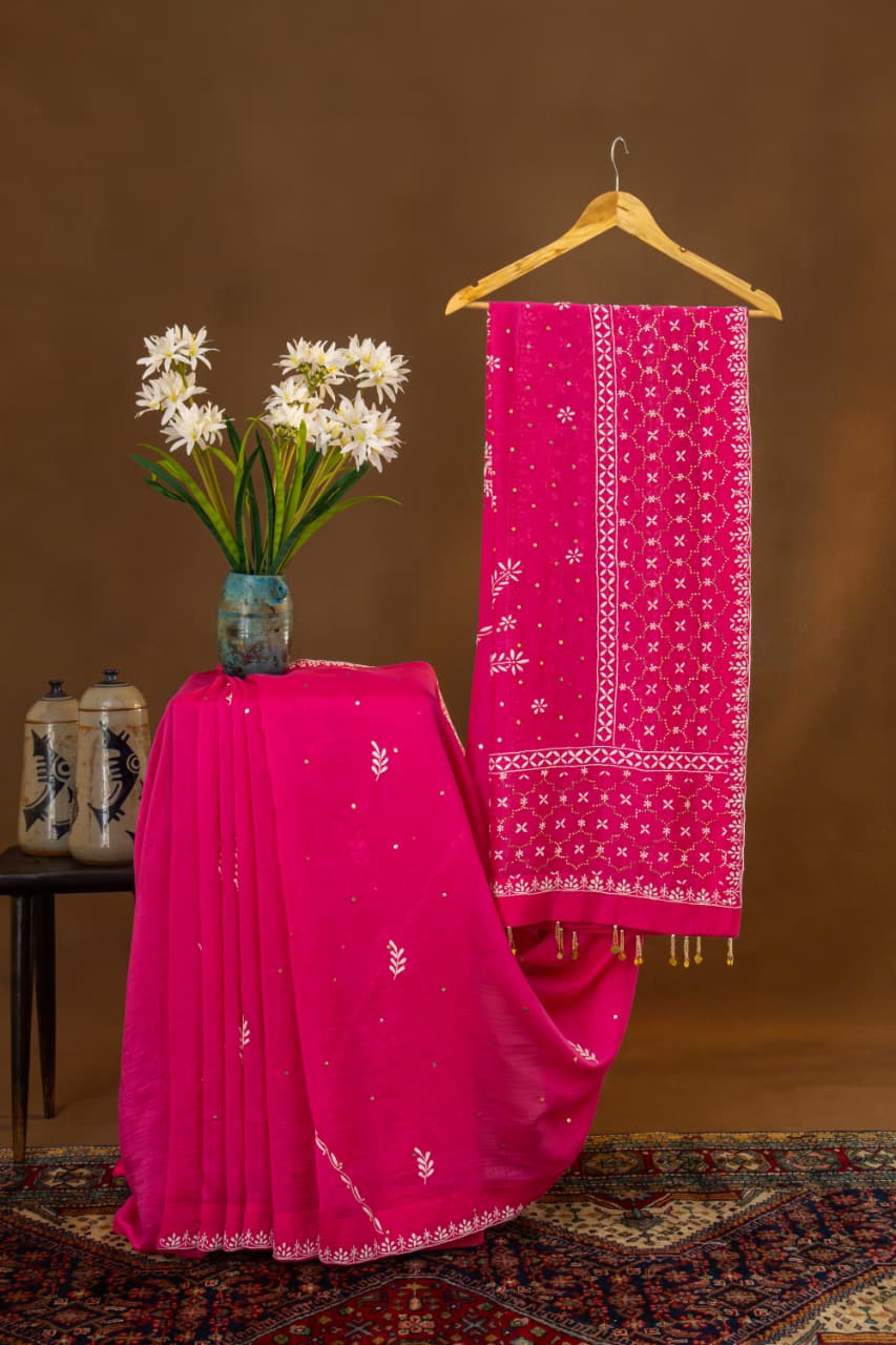 This mul chanderi saree showcases fine chikankari crafted with cotton thread, highlighted with delicate mukaish work.